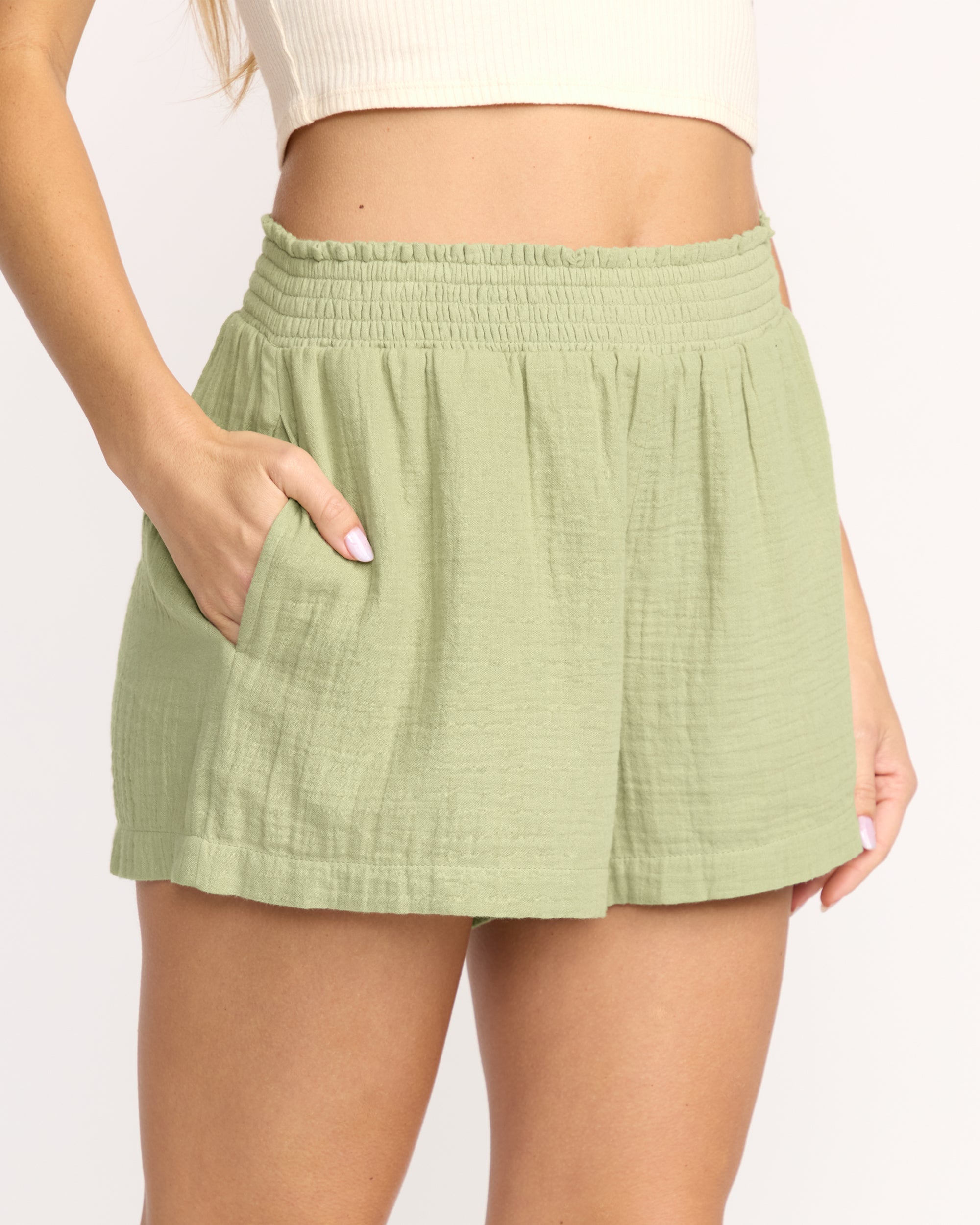 Effortless breezy style. These 100% cotton double gauze shorts keep you cool with lightweight breathable fabric. Elastic smocked waistband and relaxed regular fit provide casual all-day comfort. Side pockets stash small essentials. Featured here in the Avocado colorway.