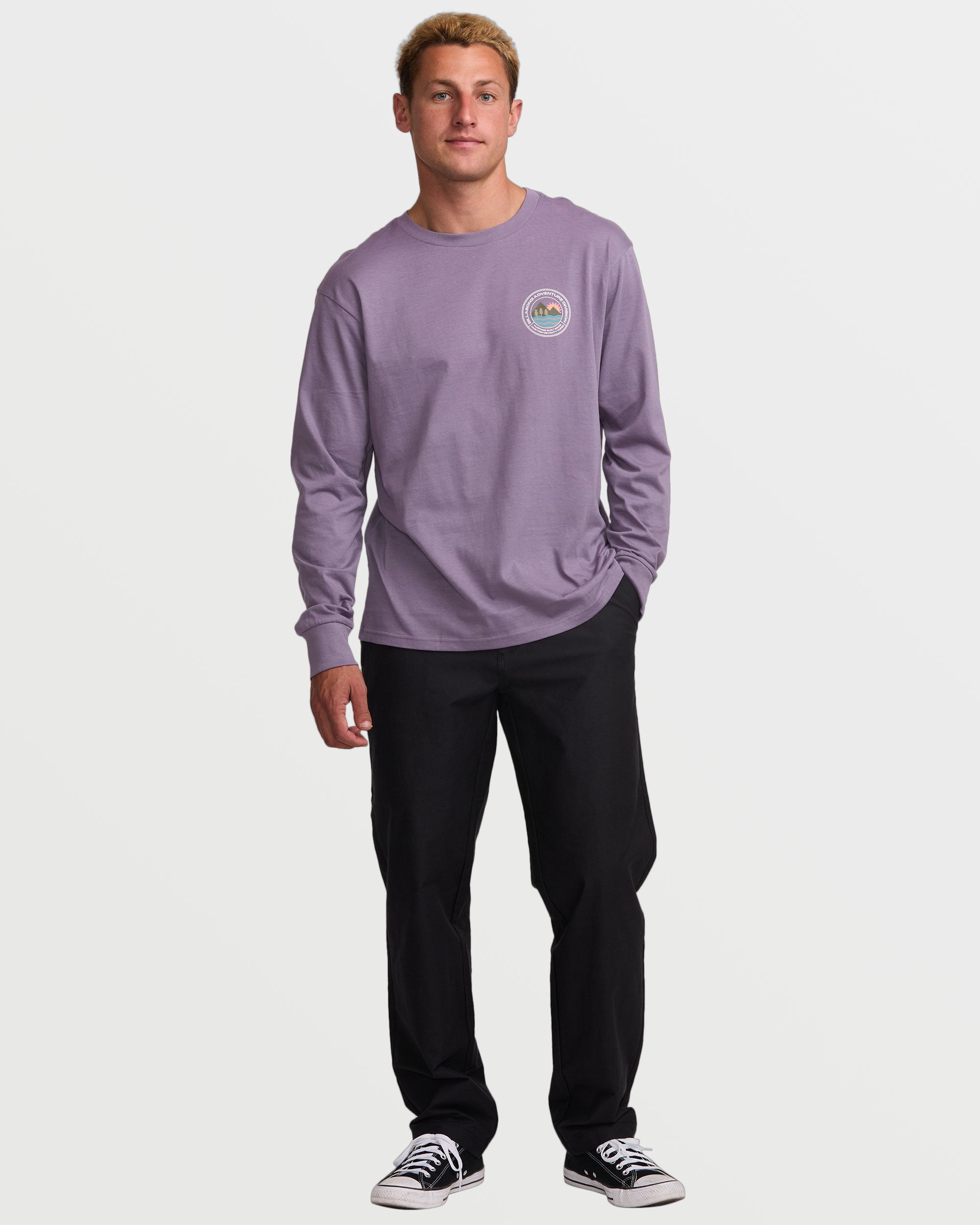 Crafted from soft. lightweight organic cotton jersey. this garment-washed tee features a timeless. core fit. Breathe easy in the 160g fabric while the dual-printed graphics front and back turn heads. Perfect for laid-back weekends or layering under your favorite hoodie. Featured here in the Lavender colorway.