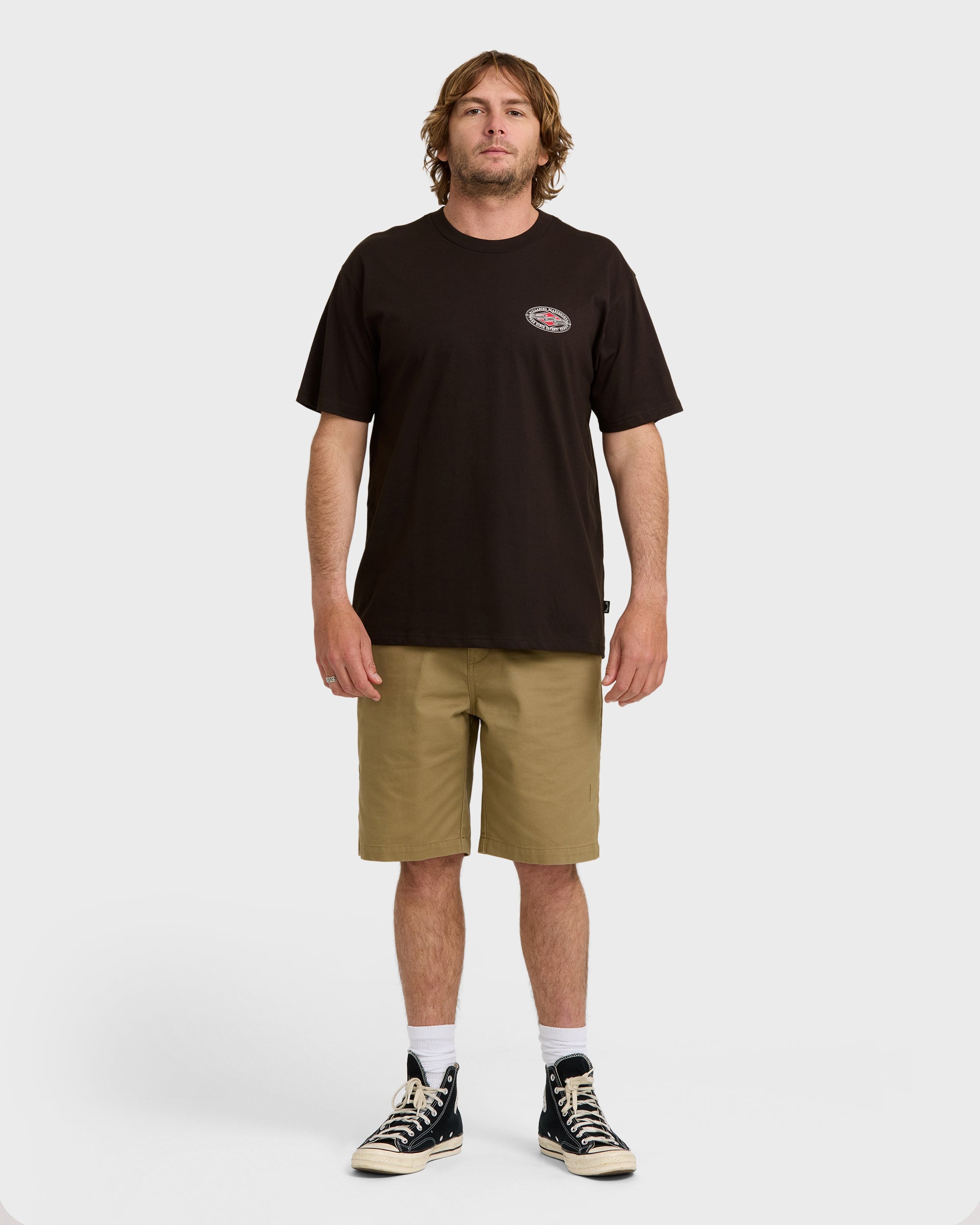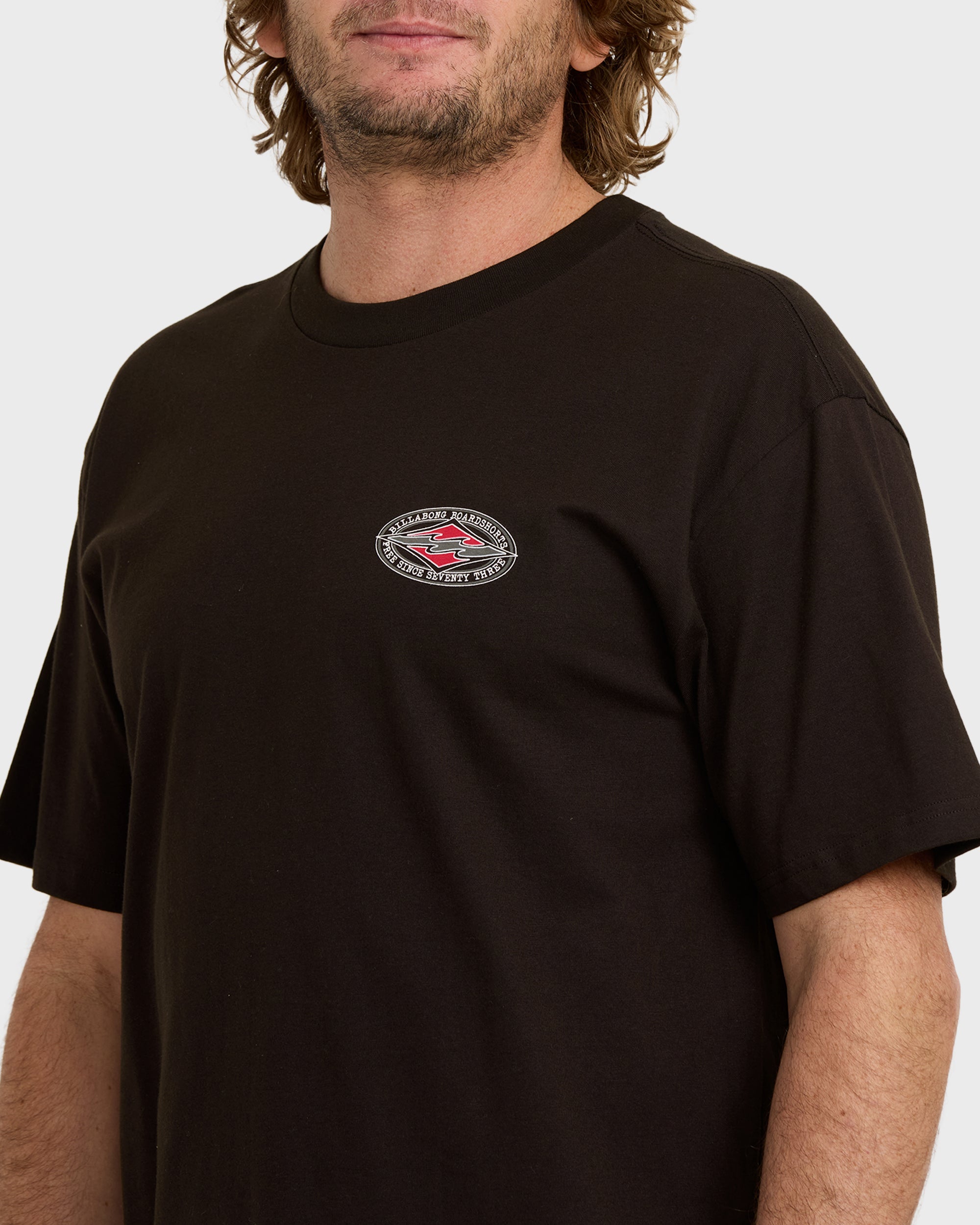 Our soft. ring-spun cotton short sleeve t-shirt delivers classic comfort with relaxed shoulders and a wider neck. Garment-washed for extra softness. with subtle screen prints front and back. Featured here in the Red colorway.