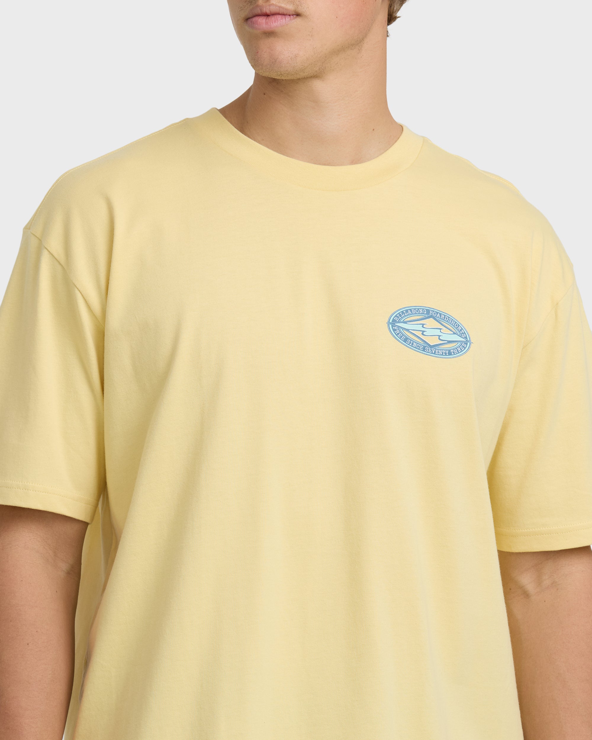 Our soft. ring-spun cotton short sleeve t-shirt delivers classic comfort with relaxed shoulders and a wider neck. Garment-washed for extra softness. with subtle screen prints front and back. Featured here in the Yellow colorway.