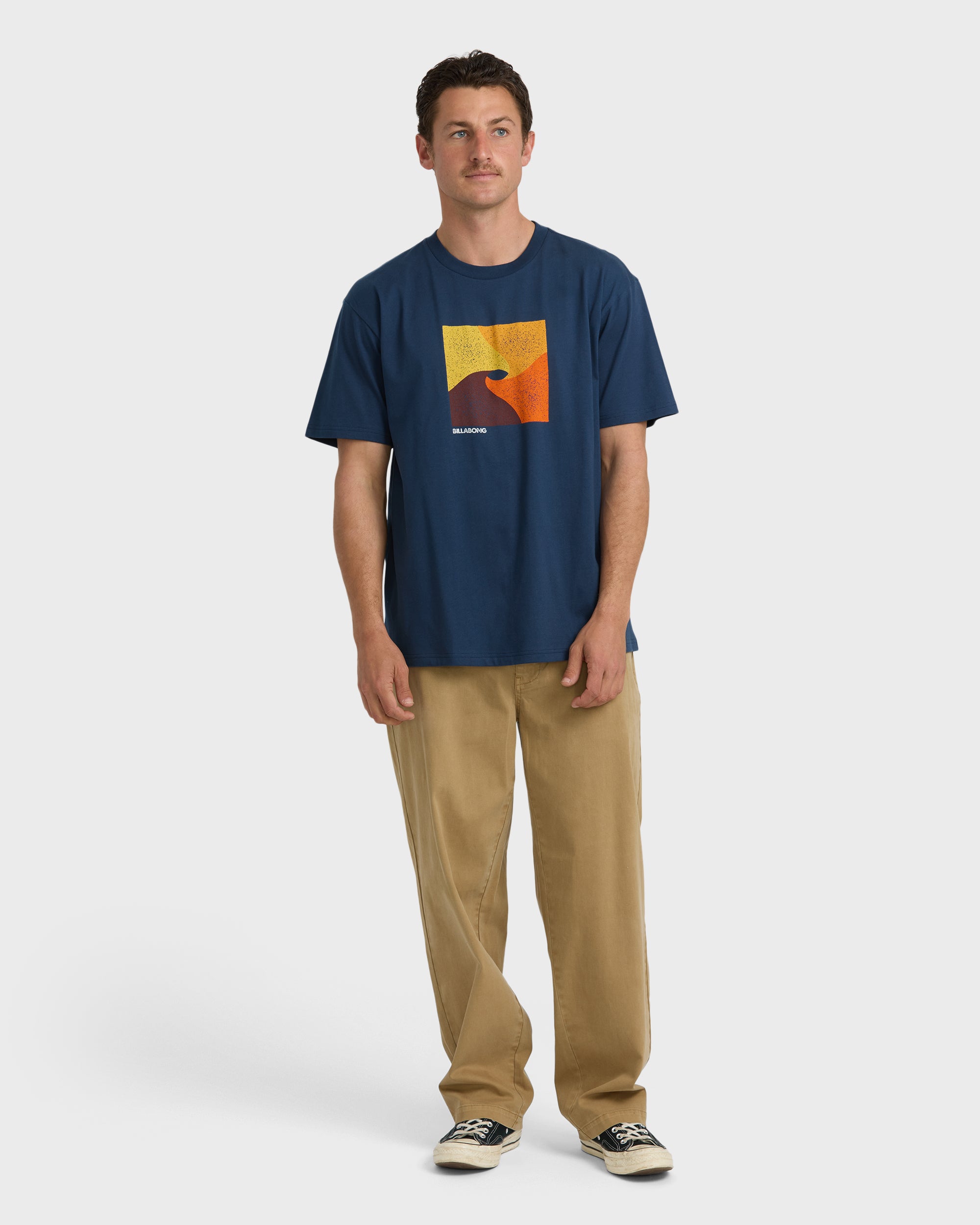 Our soft cotton t-shirt brings classic comfort with its relaxed shoulders and wider neck. The screen-printed front design catches every eye. while the garment wash gives it that lived-in feel you’ll love. Featured here in the Blue colorway.